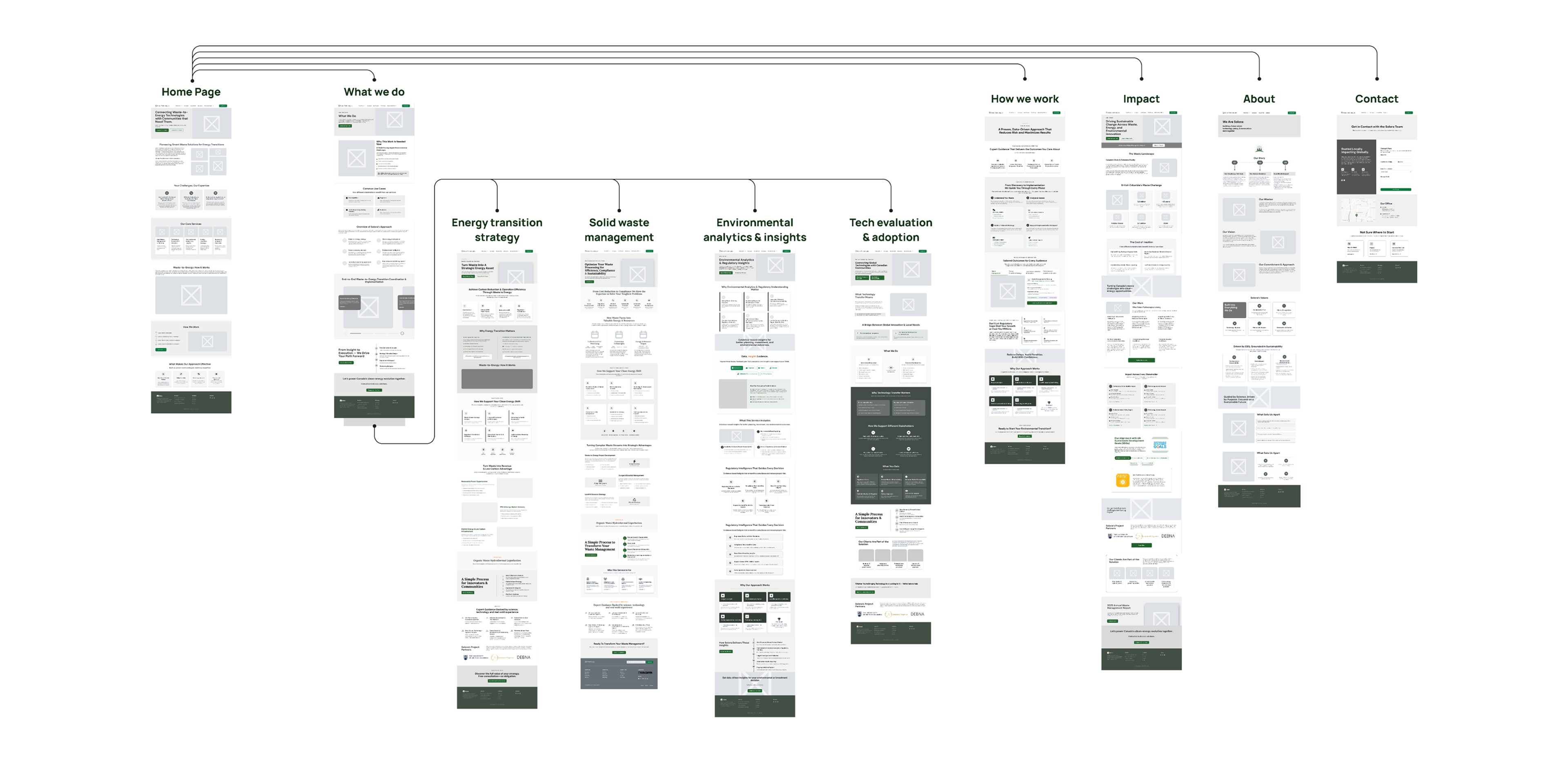 Bringing together research insights and validated wireframes, we created high-fidelity designs that transformed Solora's website into a clear, navigable, and engaging experience for all personas. We redesigned 14 pages organized into 4 main sections. Each page was crafted to serve specific user needs while maintaining visual consistency through our design system.