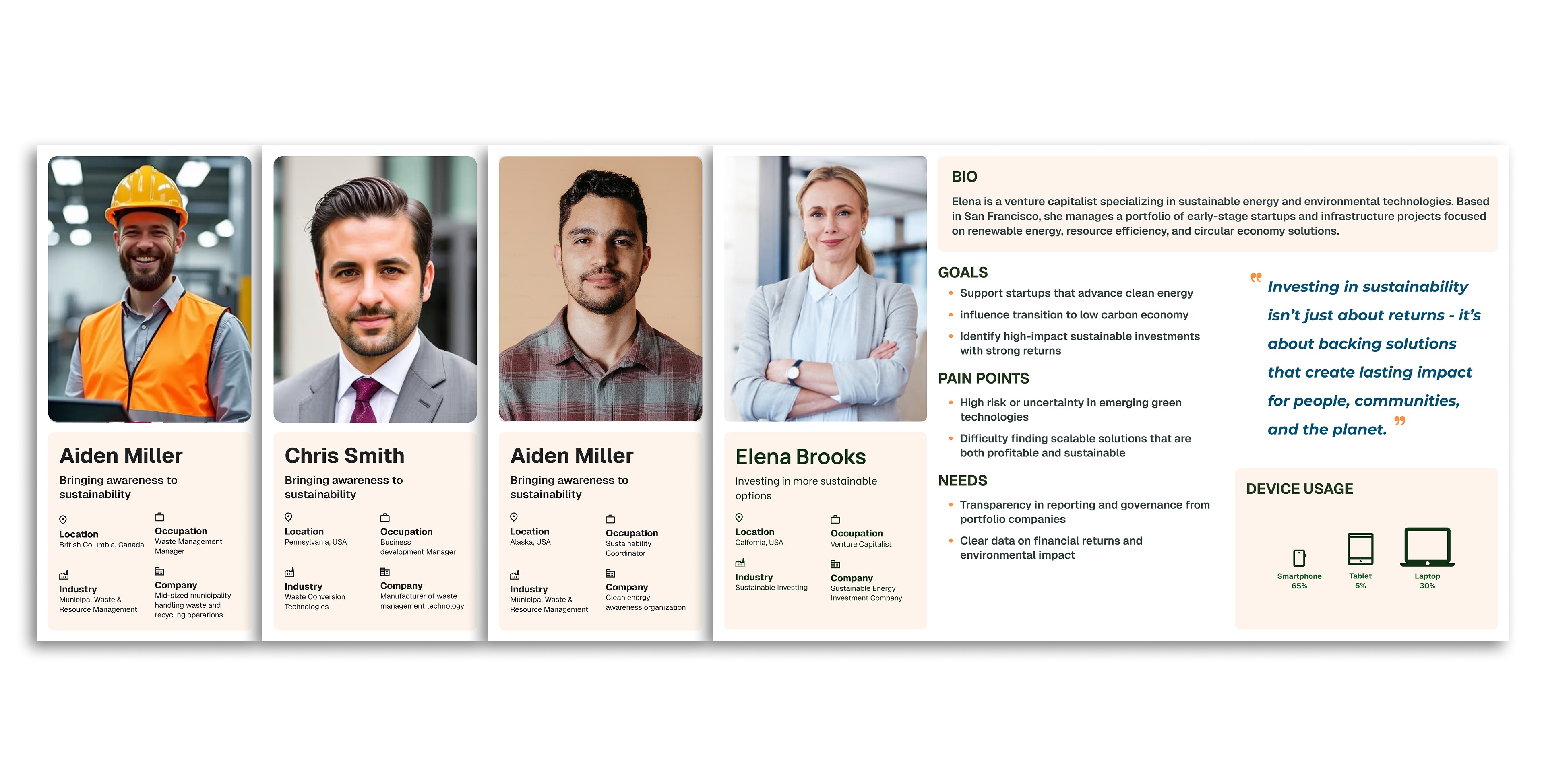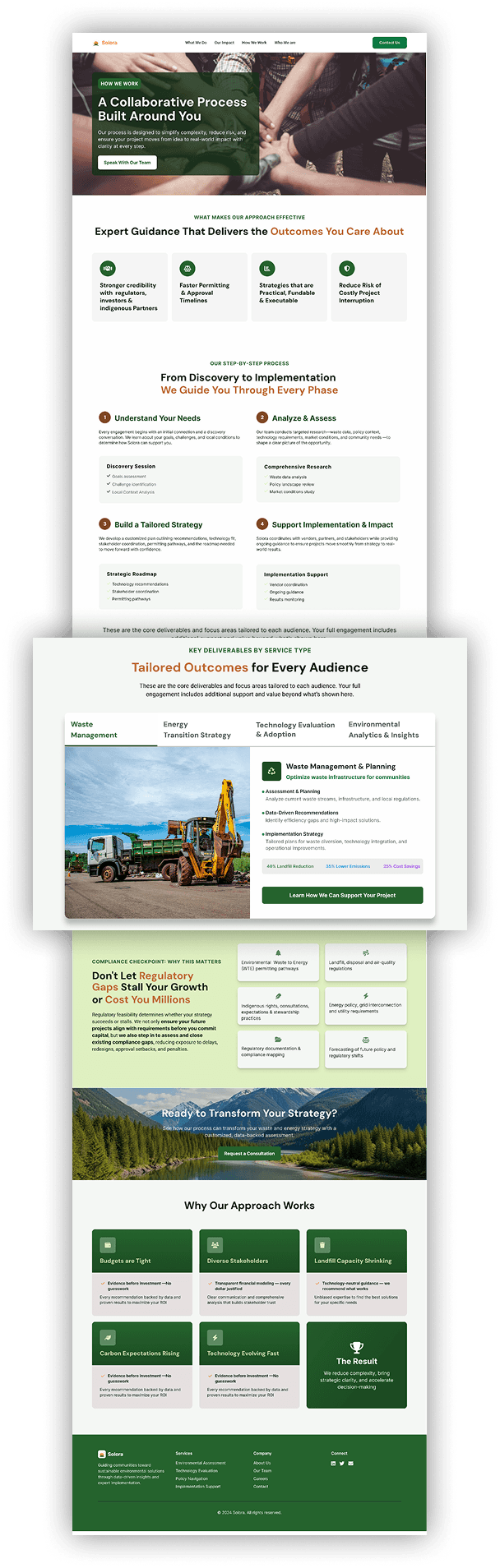 We began with stakeholder interviews to align on goals and understand Solora's diverse capabilities across five core areas: waste-to-resource solutions, clean energy, environmental analytics, technology integration, and regulatory support.