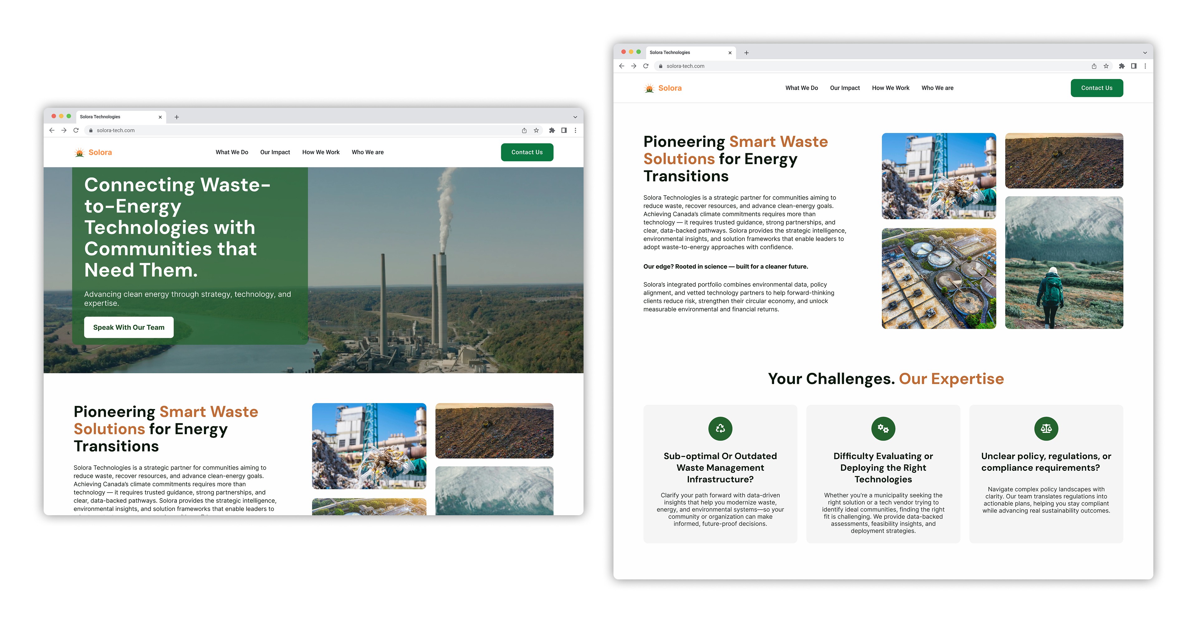 The How We Work, Our Impact, and About Us pages function as Solora's credibility architecture—reinforcing their vision, validating their expertise, and demonstrating proven results. We designed each page with intentional information hierarchies and strategic CTAs that guide users from learning about Solora's methodology to exploring tangible outcomes to taking action.