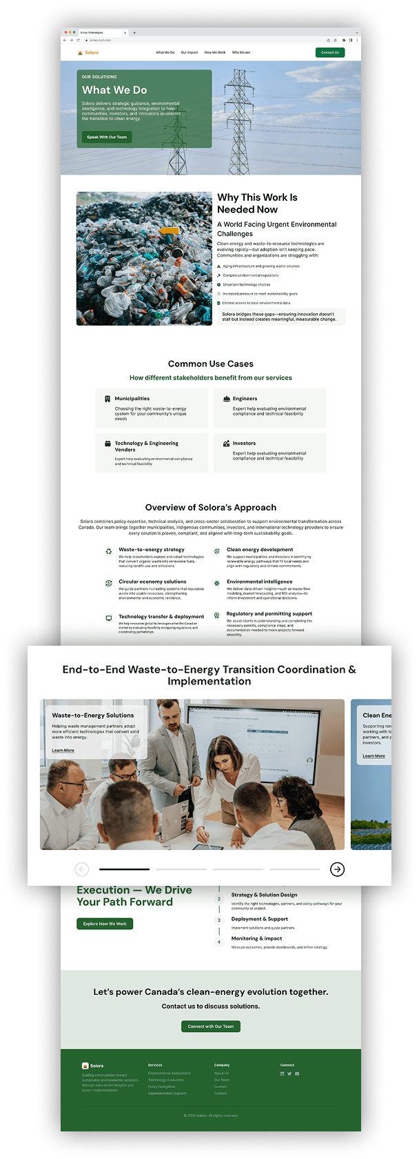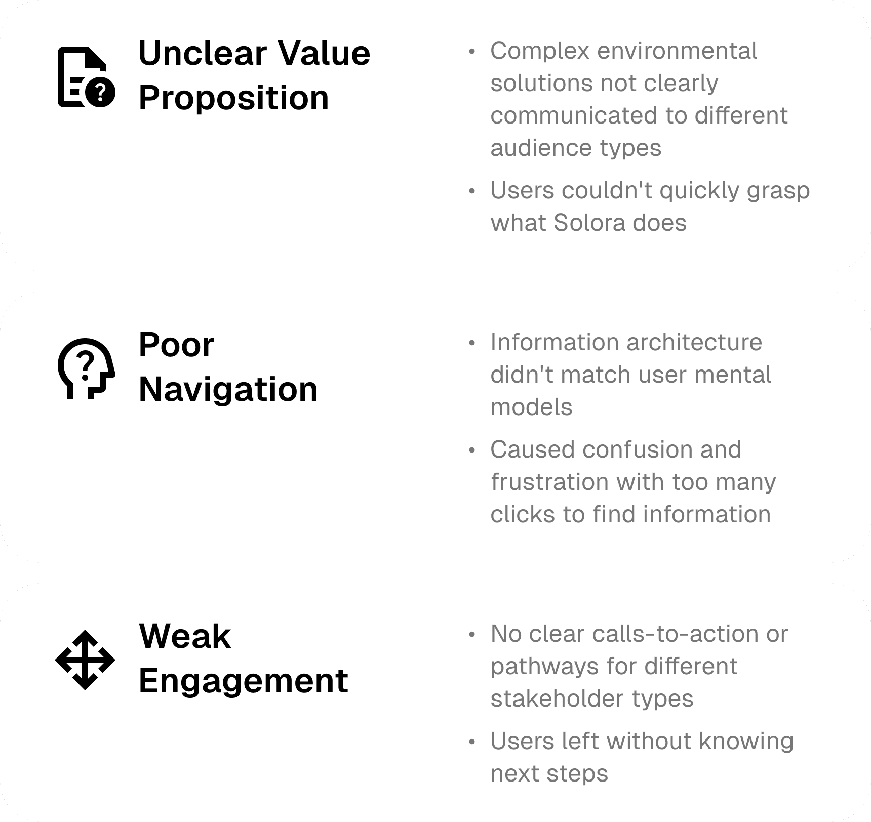 Effective B2B website design requires balancing technical credibility with accessibility. By creating clear information hierarchies, audience-specific pathways, and strategic conversion touchpoints, we transformed a complex multi-stakeholder offering into an intuitive digital experience. The result: users can self-identify their needs, understand Solora's value proposition, and take action—whether that's exploring services, reviewing impact, or initiating contact—without friction or confusion.